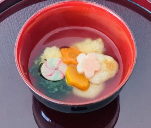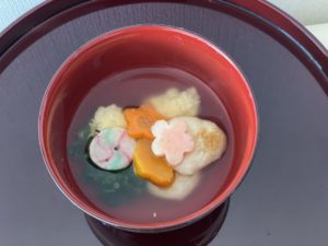 可愛らしくてお花の形や鞠の形の乾燥麩を買ってきて、お湯に付けて柔らかくなったら、薄切りにしてお雑煮の具の1番上に飾る。