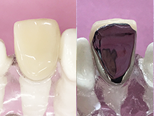 前歯の表面はレジンという樹脂(プラスチック)で白いですが、裏面は金属になります。裏打ちの全面が金属なので強度があります。自費のセラミッククラウン等と比べ、表面の白い部分が変色しやすく、耐久性に劣ります。