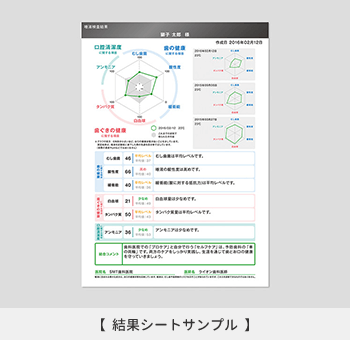 これまでの研究で得られた平均値の表示や、過去の検査結果との比較もできますので、ご自身の口腔内の状態が一目でわかります。また、結果に応じたコメントも付いていますので、今後の口腔ケアの参考にしてください。